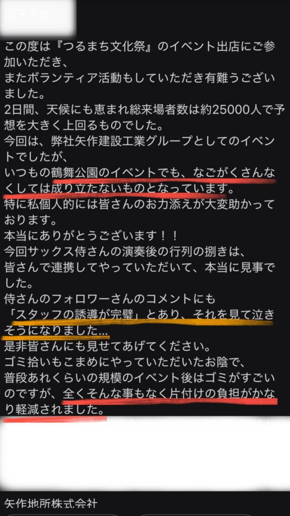 • 会場内の整備:トイレの案内やゴミ拾いなど、来場者の方が気持ちよく過ごせる環境づくり